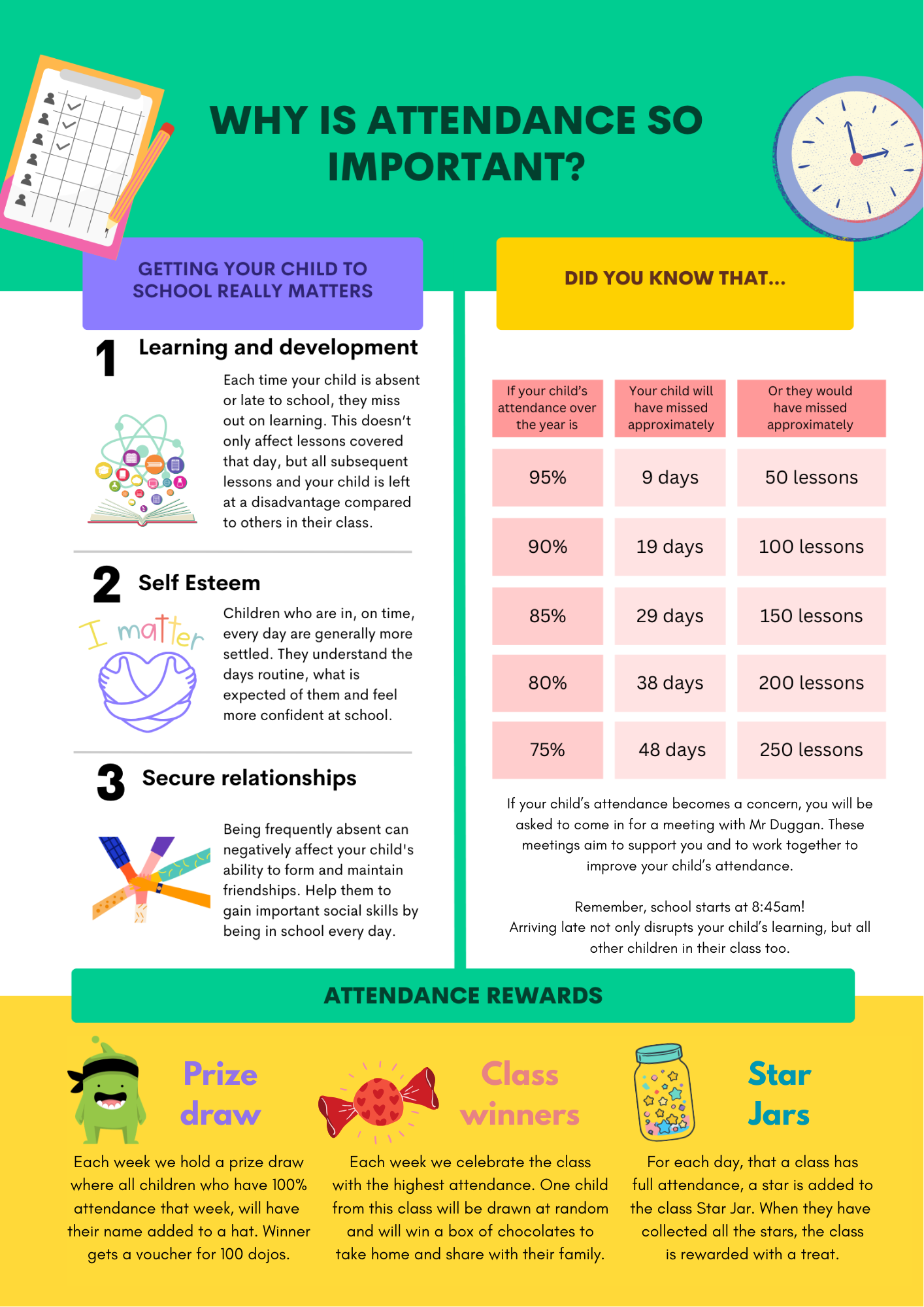 Parents will receive a letter if their child’s attendance is 93% and a further letter if attendance drops to 92% warning them that their child is at risk of persistent absence. Meetings with parents/carers will take place with Mr Duggan if a child’s attendance drops below 90%. These discussions will be supportive and will help parents to approve their child’s attendance.